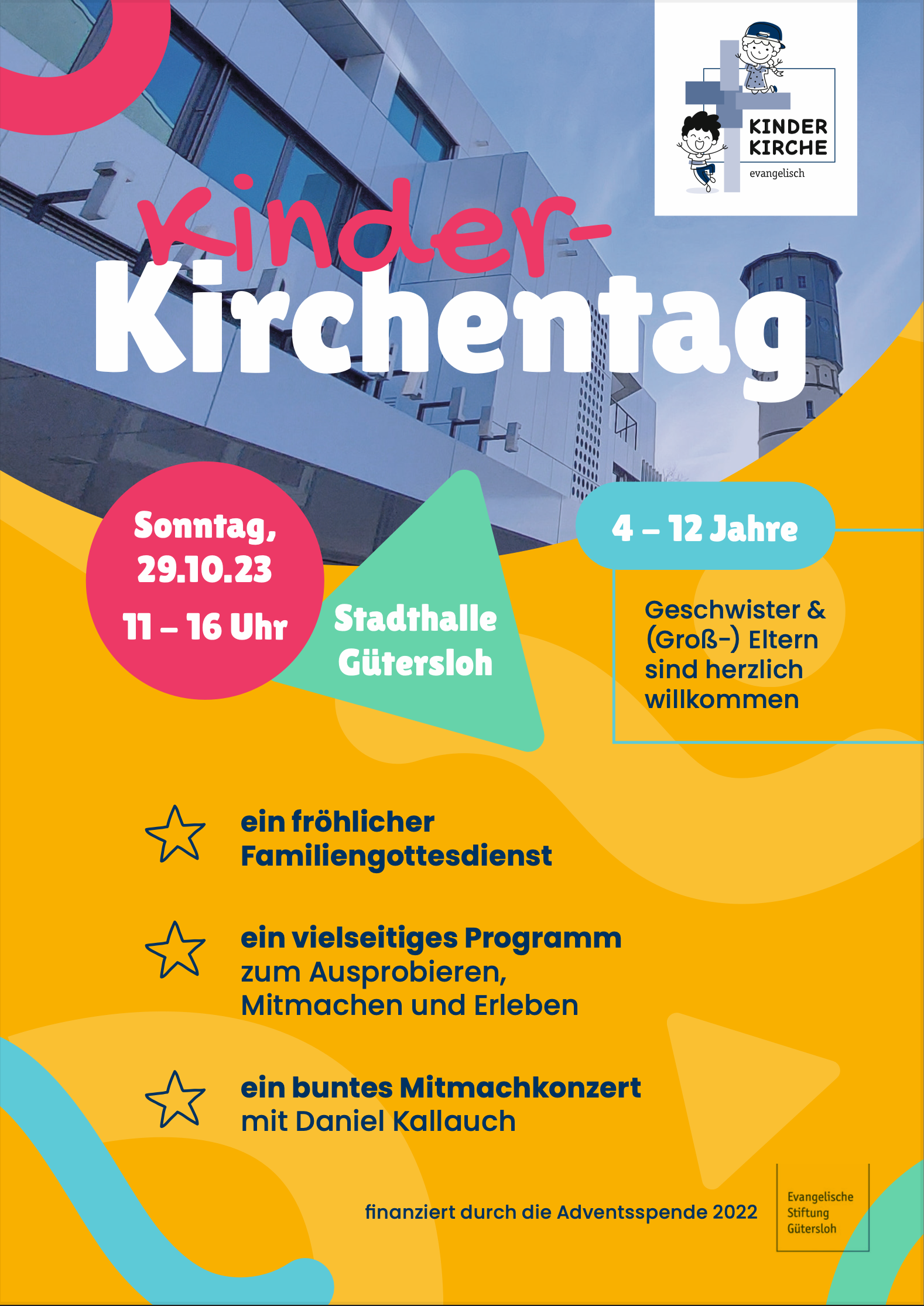 Die evangelische Kirchengemeinde Gütersloh lädt euch - Kinder von 4 bis 12 Jahren - mit euren (Groß-)Eltern zum ersten Kinderkirchentag herzlich ein. Am Sonntag, 29. Oktober gehört die Stadthalle Gütersloh von 11.00 bis 16.00 Uhr ganz Euch.